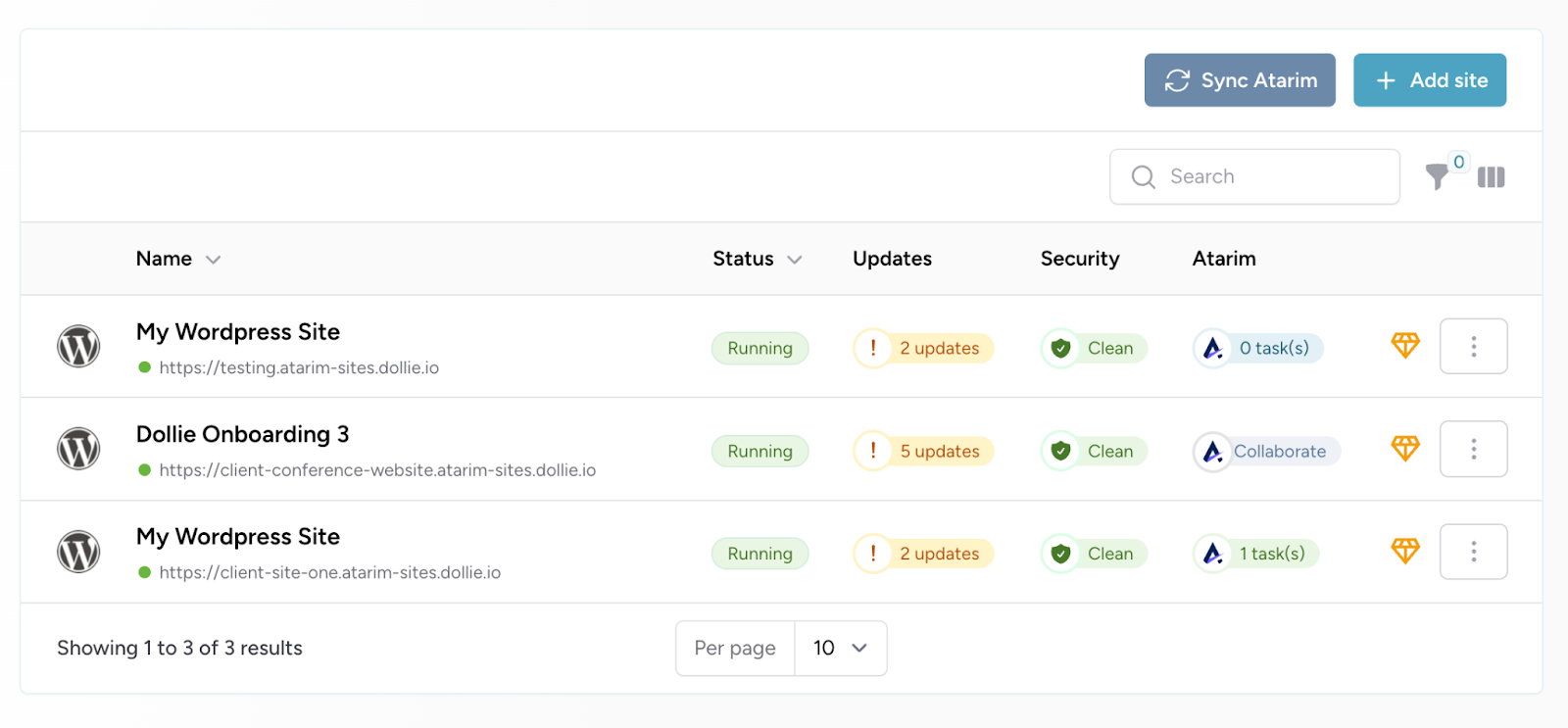 - Easily view tasks on all of your sites at a glance directly in your Dollie dashboard
