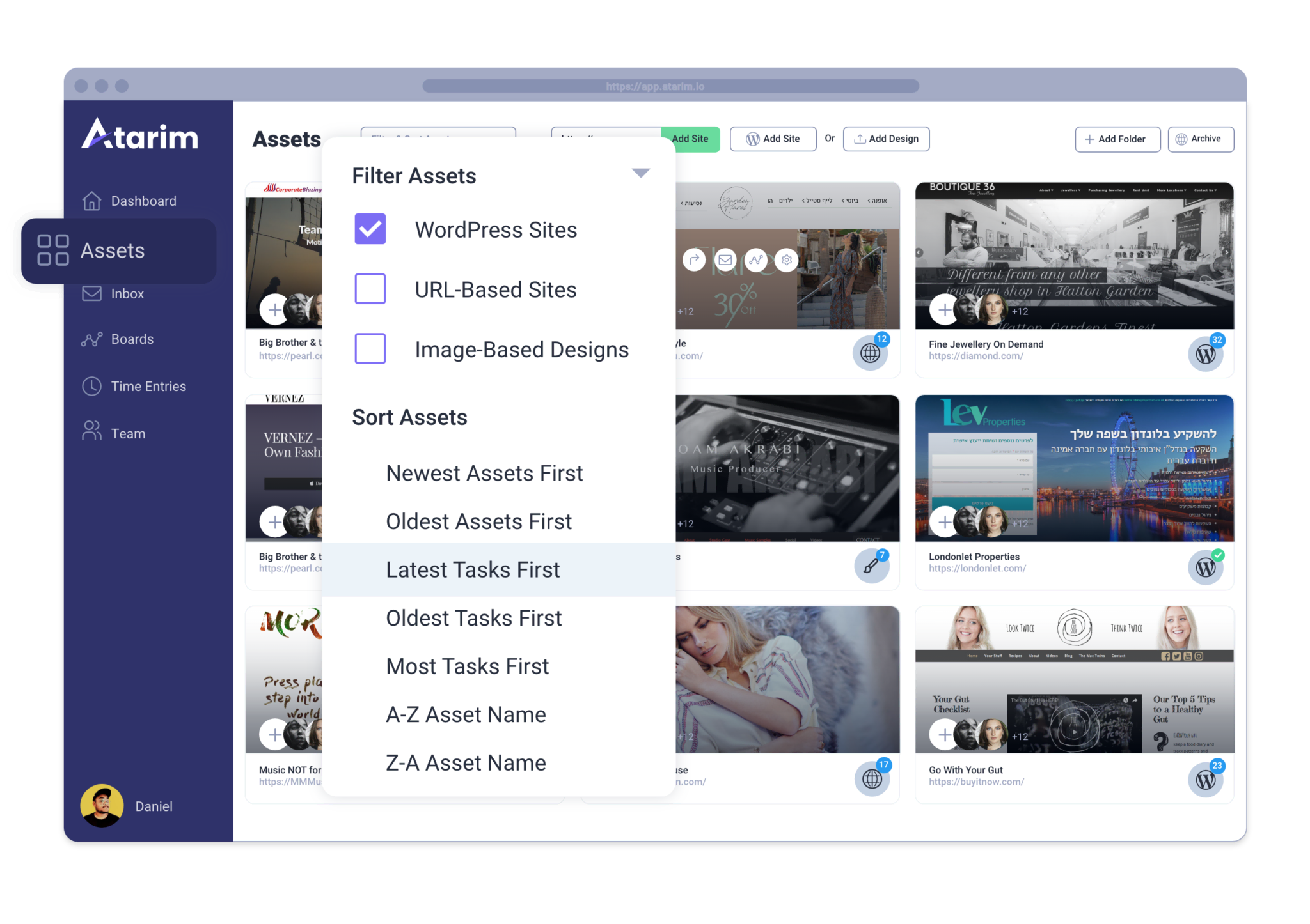 As we continue to add different types of items you can upload as assets to your Atarim Dashboard (right now including WordPress sites, sites added via URL and images), we’ve increased the number of filters on bunch of screens.