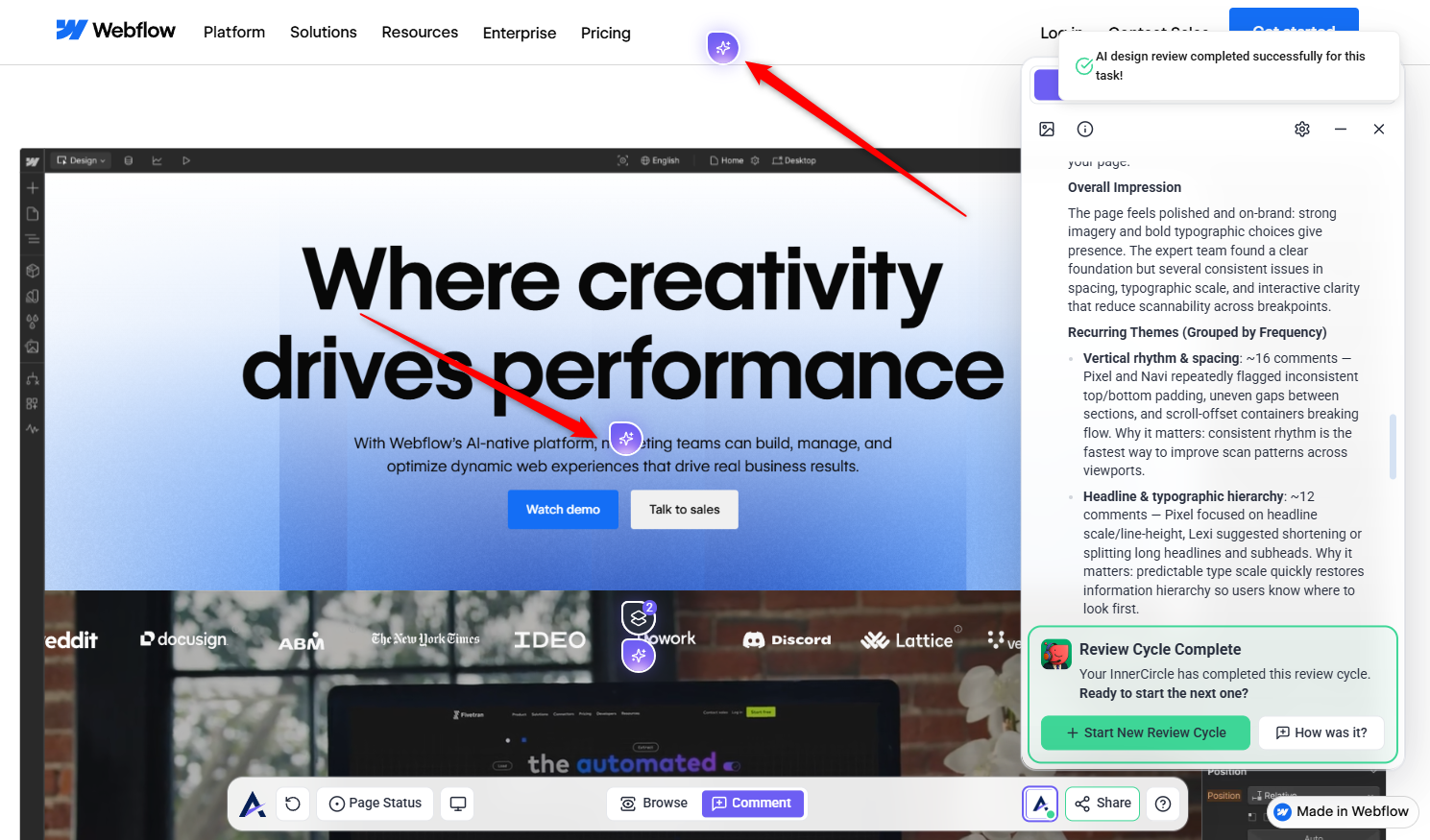 AI feedback appears directly on the canvas as visual stickers and temporary task suggestions, allowing you to review and act on them in context.