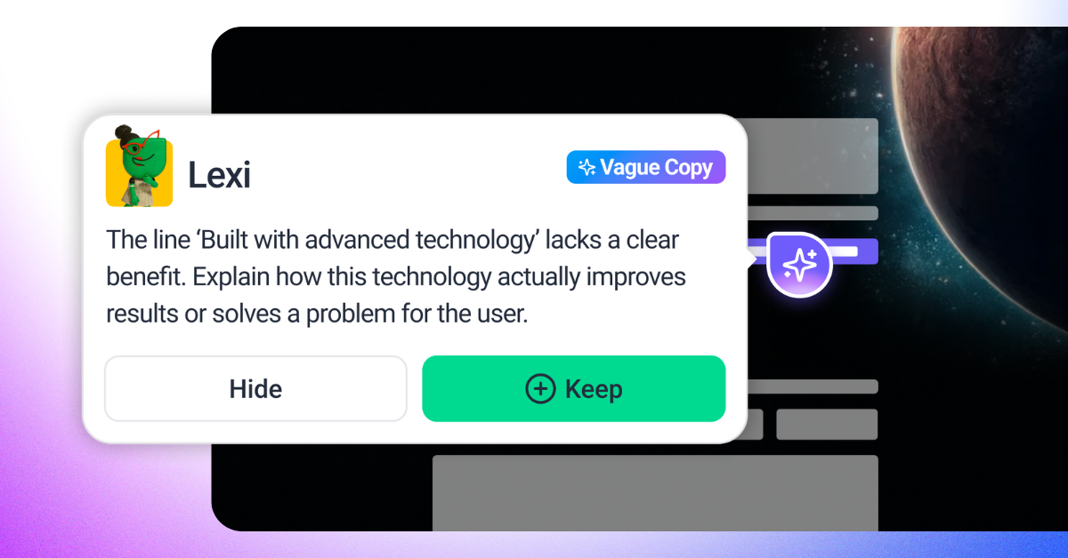 Lexi gives your team a powerful way to ensure that your copy is clear, action-oriented, and aligned with your brand voice without slowing down your workflow. Whether you’re preparing pages for launch, refining onboarding content, or running QA, Lexi helps elevate your messaging from “good enough” to conversion-ready.