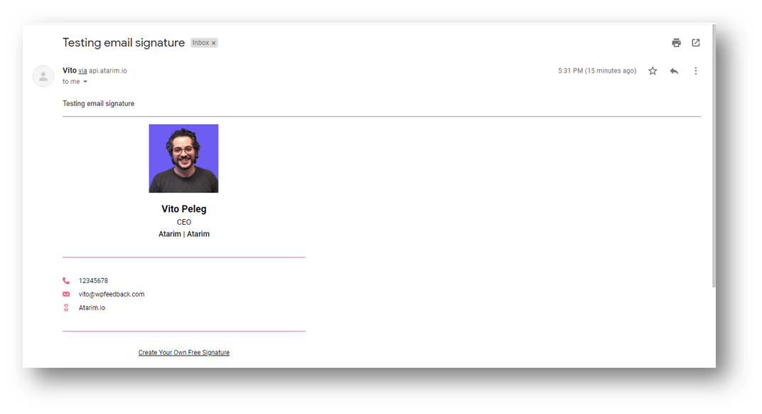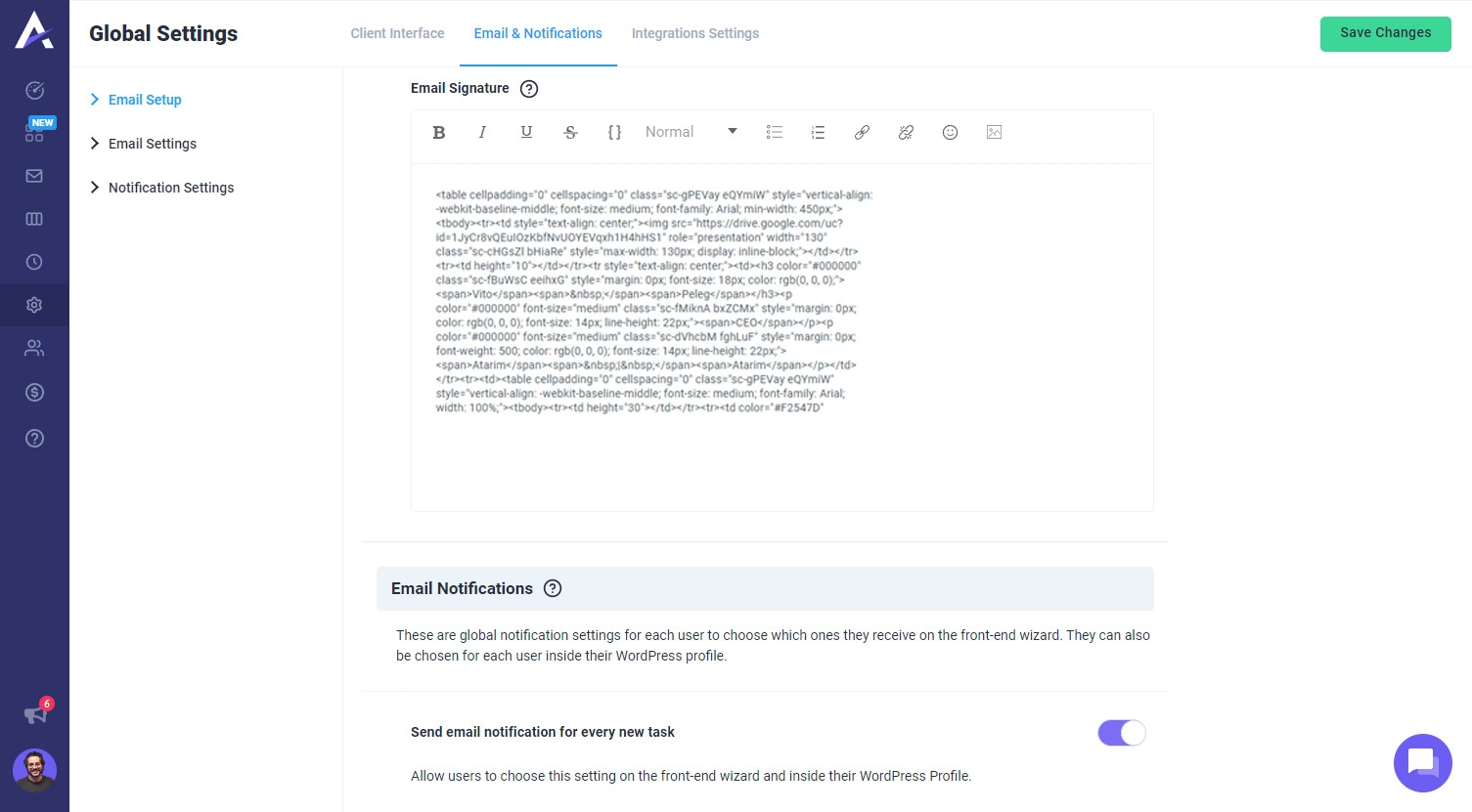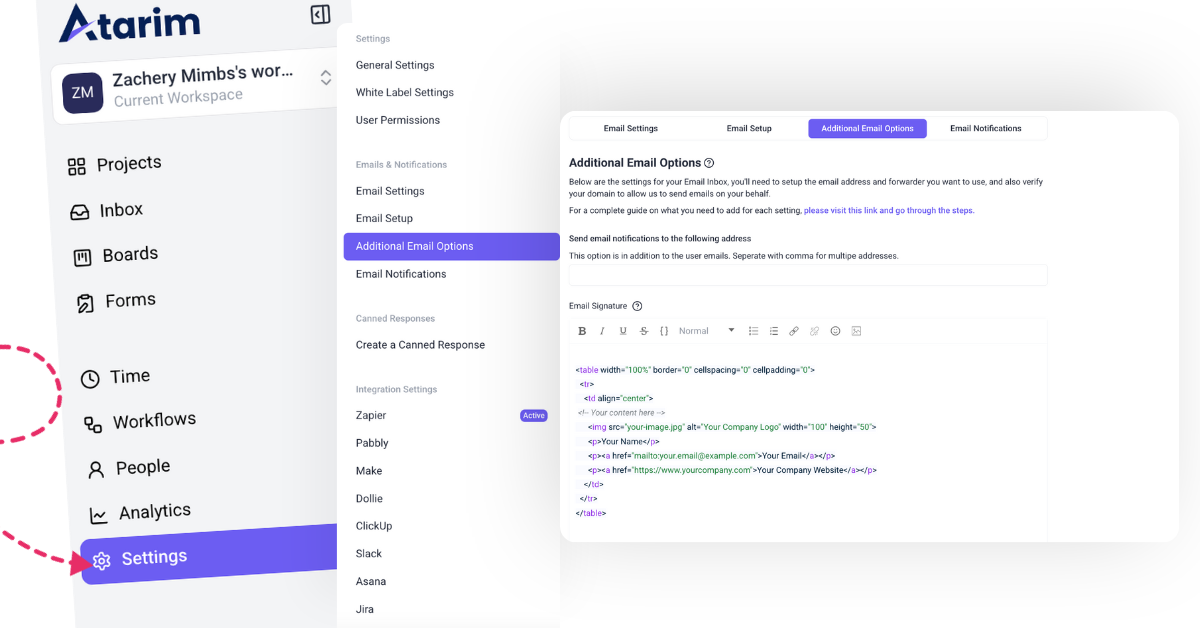 For a more customized and fully branded email signature, Atarim allows you to use HTML. This gives you full control over the layout, fonts, colors, and images in your signature.