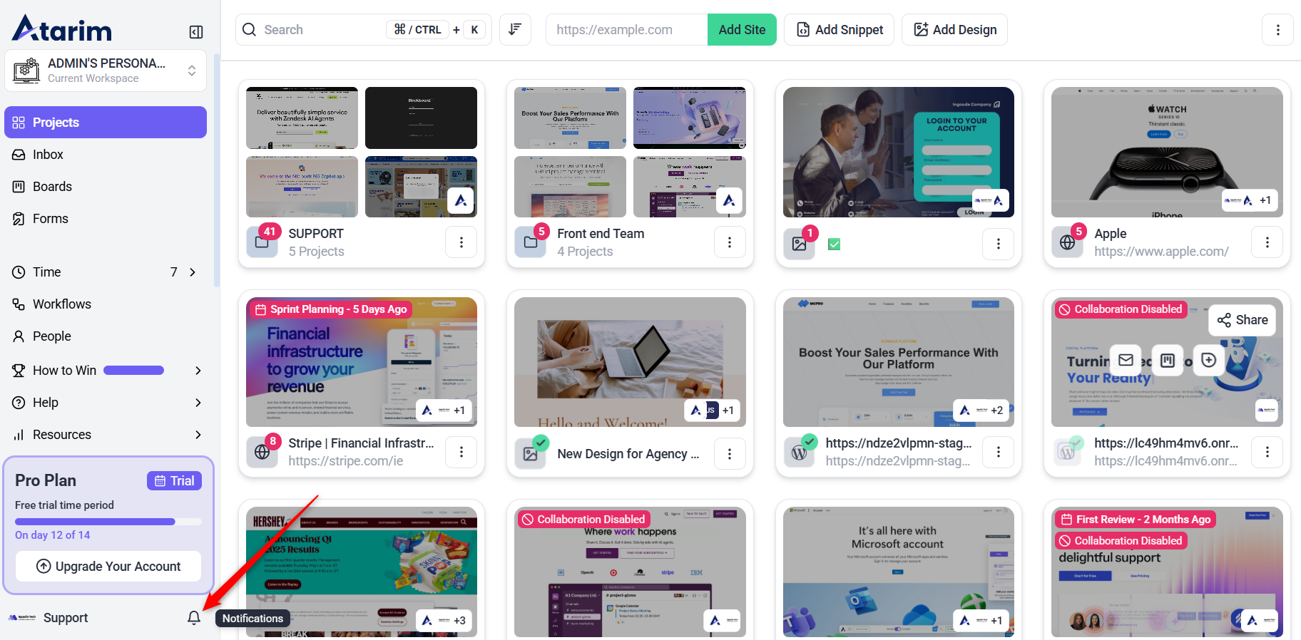 - Click on the bell icon in the left menu of the Atarim Dashboard.