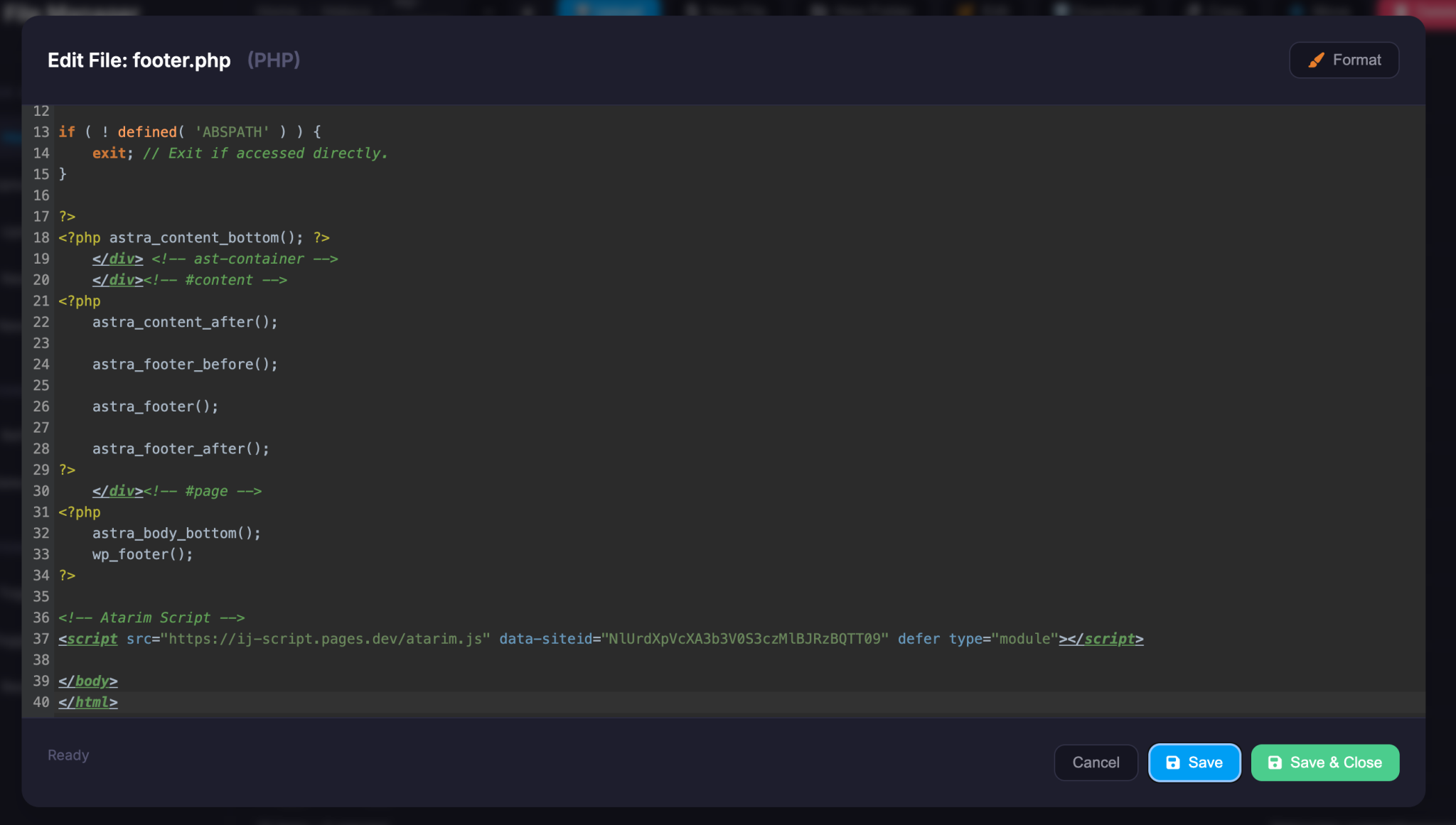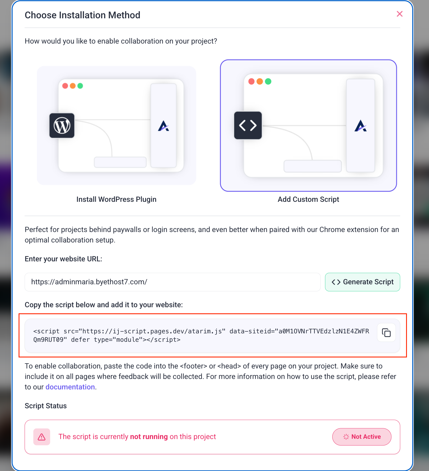 When you choose Add Custom Script, Atarim generates a small <script> tag unique to your site.