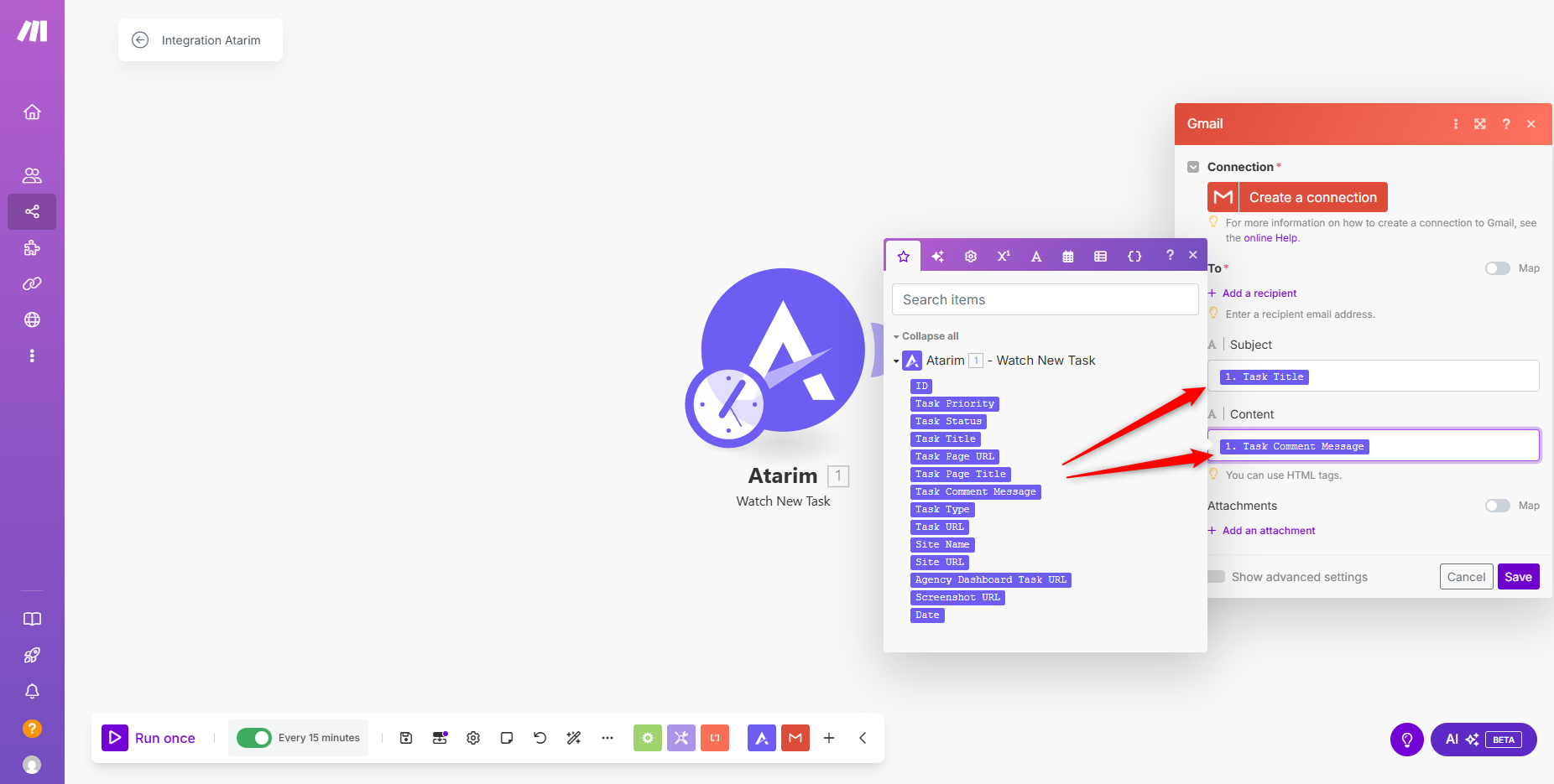 Make (formerly Integromat) is a powerful automation platform that connects Atarim with hundreds of apps to optimize your workflow. Integrating Atarim with Make enables you to automatically transfer task data to external tools, send notifications to Slack, Gmail, or other platforms when tasks are updated, and create automated workflows that keep Atarim in sync with project management tools.