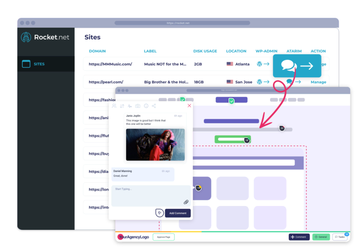 Combine Rocket.net and Atarim to create a full solution for your Digital Agency. Manage your client and team collaboration, create staging enviroments with one click and manage the hosting of your websites, all from one platform.
