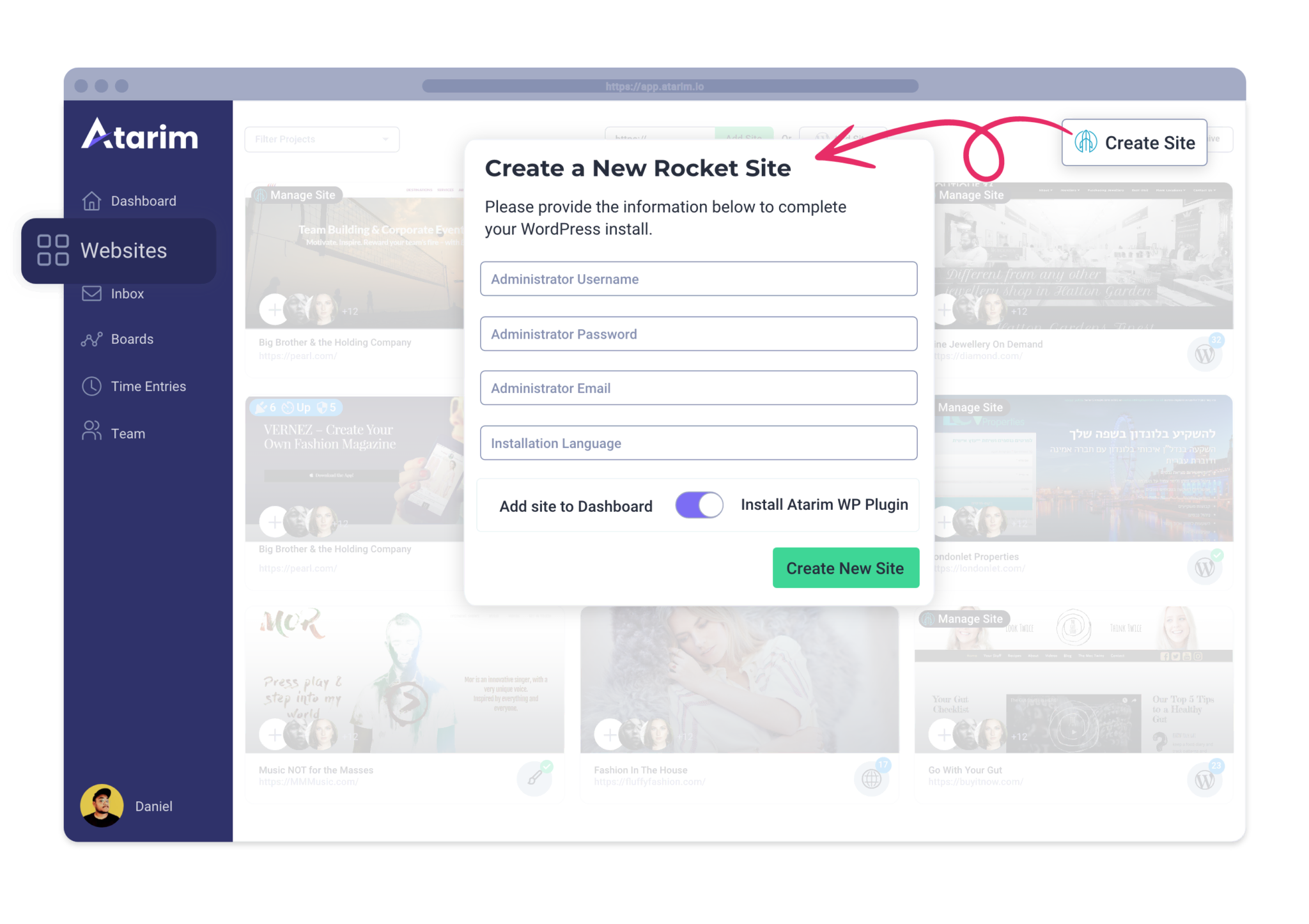 Name the website, set the username, email and password of the WordPress account and automatically install the Atarim Client Interface Plugin to start collaborating.